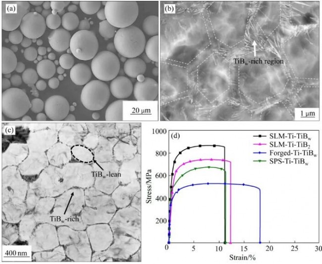 西安理工大学李树丰教授团队设计并研发了高球形度的TiBw增强的Ti基复合粉末,该粉末完全符合SLM的技术要求,避免了传统机械球磨工艺带来的粉末流动性差等缺点。该粉末具体形貌如图4(a)和(b)所示。该研究团队以该复合粉末作为原材料,利用SLM技术,制得了具有独特纳米网状结构的TiBw增强TMCs,其形貌如图4(c)所示。TiBw之所以在复合粉末以及最终制得的复合材料中以网格状、纳米尺度存在,与B原子在Ti基体中较低的固溶度以及制备过程中的较快的冷却速度有关。较高的冷却速度,使得TiBw的生长时间非常有限,在固液前沿析出的TiBw在凝固阶段被“冻结”,来不及发生粗化,最终以纳米相形式沿着初生β-Ti晶界呈网状分布。在TiBw增强DRTMCs中,纳米级的TiBw与大尺寸的TiBw相比具有更好的变形协调能力,减少了裂纹在TiBw处的萌生概率,其强度与硬度明显优于锻态及SPS制备的TiBw/Ti。