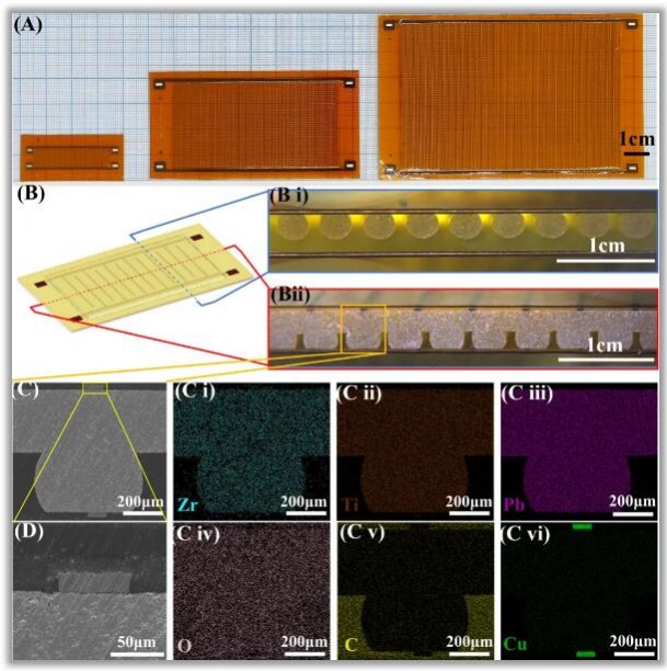 ▲图2. 三维压电复合材料(3D-FPC)的形貌。(A) 不同尺寸的3D-FPCs。(B) 3D-FPC的示意图。沿着(B (ⅰ))平行于电极方向和(B (ⅱ))垂直于电极方向的3D-FPC的横截面光学照片。(C) 3D-FPC的横截面扫描电子显微镜(SEM)图像。(C (ⅰ~ⅵ)) 能谱仪(EDS)元素映射结果。(D) 电极与陶瓷之间结合的细节。
