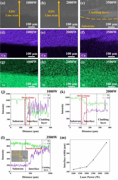 ▲图2 (a-c)不同功率下铜镍界面位置的SEM图像;(d-i)EDS面扫描和(j-l)EDS线扫描结果;(m)界面宽度