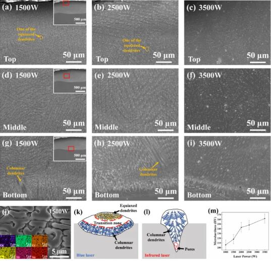 ▲图3 (a-i)熔覆层顶部、中部和底部位置的SEM图像;(j)1500 W下熔覆层的SEM图像和EDS面扫描结果;(k)蓝激光和(l)红外激光熔池微观结构示意图;(m)不同功率下熔覆层的显微硬度