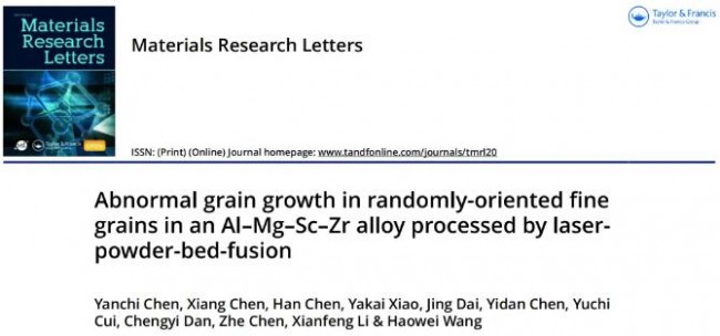 Yanchi Chen, Xiang Chen, Han Chen, Yakai Xiao, Jing Dai, Yidan Chen, Yuchi Cui*, Chengyi Dan, Zhe Chen*, Xianfeng Li* & Haowei Wang(2024) Abnormal grain growth in randomly-oriented fine grains in an Al–Mg–Sc–Zr alloy processed by laser-powder-bed-fusion, Materials Research Letters, 12:9, 635-643.