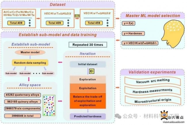 中/高熵合金由于特殊的微观结构和出色的性能而受到重视,但传统合金成分设计方法费时费力。新兴的机器学习提供了一种高效的解决方案。团队从不同合金系统中收集和扩展了成分-显微硬度数据对,使用生成对抗网络将这些数据对转换为经验参数-显微硬度对【Mater Des 238 (2024) 112634】;团队采用主动学习方法对Al-Co-Cr-Cu-Fe-Ni系统进行筛选,并确定XGBoost作为最佳深度学习主模型;团队使用XGBoost子模型进行数百万次数据训练迭代(图1),利用EI算法进行准确性评估,建立了高熵合金成分与显微硬度之间的关系,所提出子模型与实验数据良好一致。