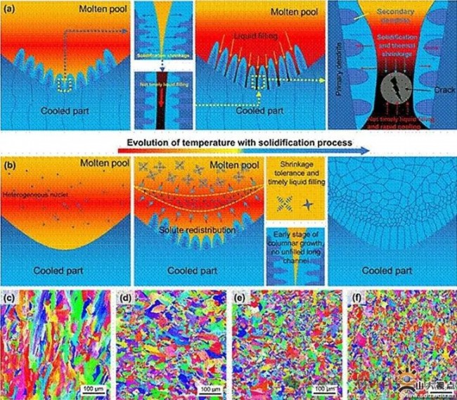 ▲图4 增材制造过程中添加铁基非晶合金粉末对熔池凝固过程和微观结构的影响