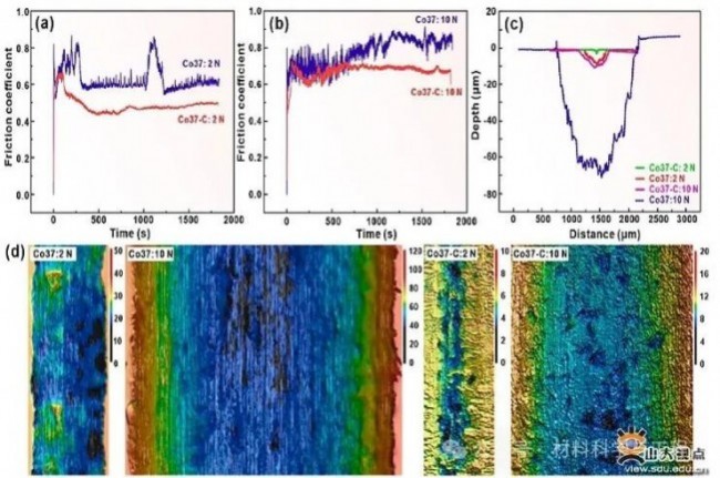 ▲图5 添加碳前后(即Co37和Co37-C)高熵样品在(a)2 N和(b)10 N载荷下的典型摩擦系数曲线;(c) Co37和Co37-C样品在2 N和10 N载荷下的磨损轨迹的二维横截面图以及(d)磨损轨迹的三维形貌图