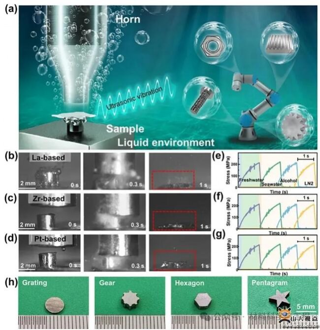 ▲图6 (a)非晶合金的超声振动成形示意图和用于机器人制造的组件,(b)镧基、(c)锆基、(d)铂基非晶合金超声振动成形过程的高速成像,(e)镧基、(f)锆基、(g)铂基非晶合金超声振动成形过程中采集实时的应力-应变曲线,(h)在海水中通过超声振动加工的光栅、齿轮、六边形和五角星的外貌图。
