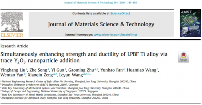 Yinghang Liu, Zhe Song, Yi Guo, Gaoming Zhu, Yunhao Fan, Huamiao Wang, Wentao Yan, Xiaoqin Zeng, Leyun Wang, Simultaneously enhancing strength and ductility of LPBF Ti alloy via trace Y₂O₃ nanoparticle addition, J. Mater. Sci. Technol. 191 (2024) 146-156.