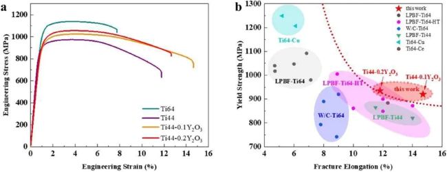 (2)LPBF Ti44–0.1Y₂O₃展现出优异的强度与延展性组合