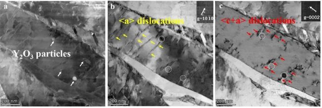 (4)Y₂O₃纳米颗粒引发了更多〈c + a〉位错的形成