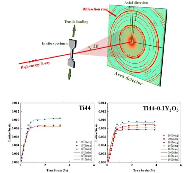 增材制造(AM)钛合金的强度与塑性平衡一直是材料研究领域的重大挑战,传统LPBF工艺常导致强度提升的同时伴随延展性显著下降,限制了其在高性能领域的应用。本研究探讨了向预合金化Ti-4Al-4V(Ti44)粉末中添加微量Y₂O₃纳米颗粒的效果,与常用的热处理LPBF Ti64合金相比,Ti44-Y₂O₃材料展现出了更为优异的强度-塑性组合表现,突破了强度塑性无法同步提升的瓶颈。基于原位同步辐射X射线衍射及弹性-粘塑性自洽(EVPSC)建模分析了变形机制。本研究表明,LPBF是一种制造金属纳米颗粒复合材料的极佳方法。