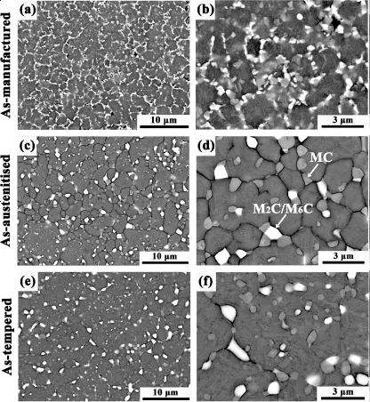 对于制造状态(图 1a和1b),碳化物分布在原奥氏体晶界处,形成不连续的网络。存在两种类型的碳化物:较亮的是富含 Mo、W 的 M2C/M6C 碳化物,较暗的是富含 V 的 MC 碳化物。奥氏体化后(图 1c和1d),碳化物网络消失,由离散的大颗粒取代。大多数颗粒位于多个晶粒的交界处;晶粒内部往往出现形状圆整、尺寸较小的碳化物。回火后(图1e、1f)出现大量细小的碳化物,且在晶粒内部分布比较均匀,交界处碳化物无变化。
