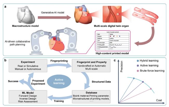 最后,作者指出了生物3D打印中AI技术的未来方向,包括构建自然器官的流程;闭环主动学习流程以及蛮力学习、主动学习和混合学习的“精度成本”图景。
