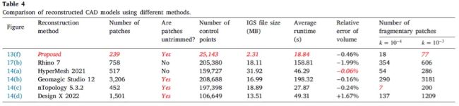 Python代码(PYTOCAD)和所有测试模型均可在https://github.com/rhy-thu/AMRTO或https://zenodo.org/records/14381998上下载。该方法在多项性能指标(包括运行效率、CAD模型的NURBS面片及控制点数量、模型文件大小、鲁棒性、对输入网格的容忍度、细碎面片的数量及调控灵活性)上优于多款主流商业软件,包括Rhino 7、Hypermesh 2021、Design X 2022、nTopology 5.3.2、Geomagic Studio 12、Abaqus 6.14和COMSOL 6.2。