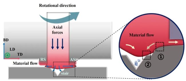 在AFSD修复过程中,工具头与基体摩擦热是主要热源,影响材料软化和填充效果,当修复结构达到一定深度会因热量不足导致材料无法有效混合。以Vstair为例,阶梯化结构有效增加了接触面积,促进了材料混合和界面结合,旋转的修复工具头带动进料与基体接触,在轴向力作用下,进料因摩擦热软化。修复结构边缘在搅拌头作用下破碎,软化材料流入损伤槽并与阶梯结构相互作用。在轴向力作用下,大剪切变形促进了修复界面处材料的混合与连接,表明合理的修复结构设计对AFSD修复质量有着重要影响。