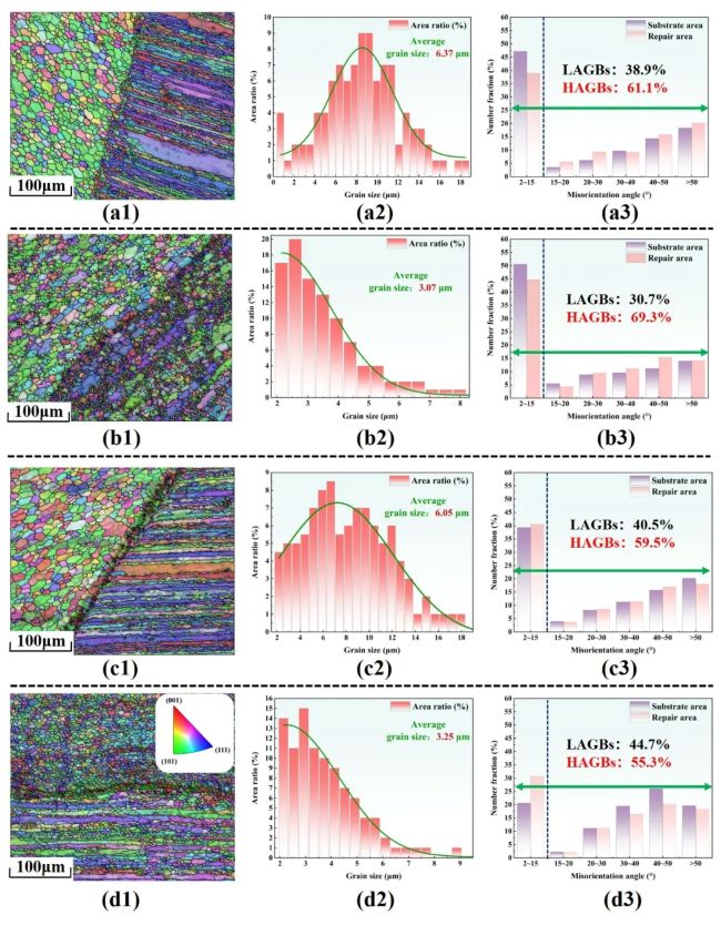· 四种损伤槽的前进侧在修复过程中被破坏并重建,修复后原来规则的界面变成锯齿状,前进侧的界面结合质量明显优于返回侧。Vstair 的修复质量和晶粒细化效果最好,与基材相比,晶粒细化 93.6%。