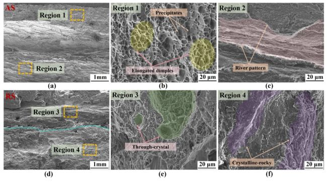 Vstair拉伸试样断口分析显示,AS侧存在塑性和脆性断裂特征,RS侧多为脆性断裂。AS侧塑性断裂区域有微腔合并、小凹陷及典型的韧性断裂特征,脆性断裂区域呈现厚且长的河流状花样;RS 侧存在大凹陷区域和非均匀穿晶断裂特征,进一步直观地解释了 RS 室温拉伸强度较弱的原因。