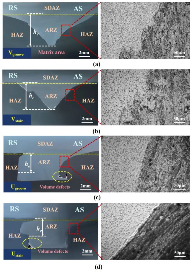 本论文针对铝合金表面损伤缺陷,阶梯化设计并加工制备出不同的修复结构(V形槽-Vgroove,阶梯V形槽-Vstair,U形槽-Ugroove,阶梯U形槽-Ustair),利用本团队自主研发的 AFSD 设备开展修复实验。系统性研究了不同修复结构设计对 Al-Zn-Mg-Cu 铝合金 AFSD 修复性能的影响,揭示了界面阶梯化结构设计对于修复后微观组织与性能的调控机制。