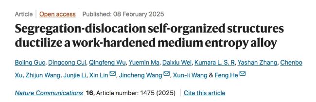 相关成果以“Segregation-dislocation self-organized structures ductilize a work-hardened medium entropy alloy”为题,发表于国际权威期刊《自然·通讯》(Nature Communications),西北工业大学为论文的唯一通讯单位。西北工业大学何峰教授、王锦程教授、林鑫教授为共同通讯作者,西北工业大学博士生郭博静为第一作者。