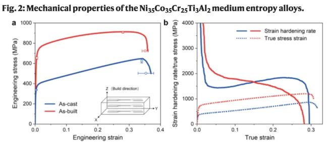 图2 Ni35Co35Cr25Ti3Al2中熵合金力学性能:a,沉积态及铸态合金工程应力-应变曲线,插图显示了沉积态拉伸试样取样示意图; b, 应变硬化率/真应力-真应变曲线。