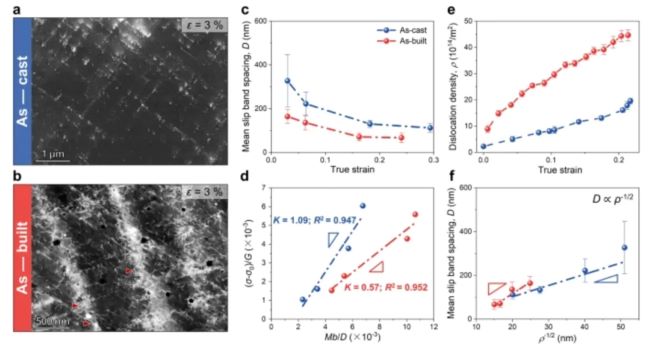 图3 Ni35Co35Cr25Ti3Al2中熵合金变形组织及其演化。a, 铸态合金在ε = 3%应变水平下的ECCI图片,表现出明显的平面滑移特征;b, 沉积态合金变形组织,其中部分平面滑移带被SD-SOS边界阻碍,如红色箭头所示; c, 平均滑移带间距随真应变的演化规律; d, 铸态和沉积态合金相似关系图; e, 位错密度随真应变的变化; f, 平均滑移带间距与位错密度的关系。