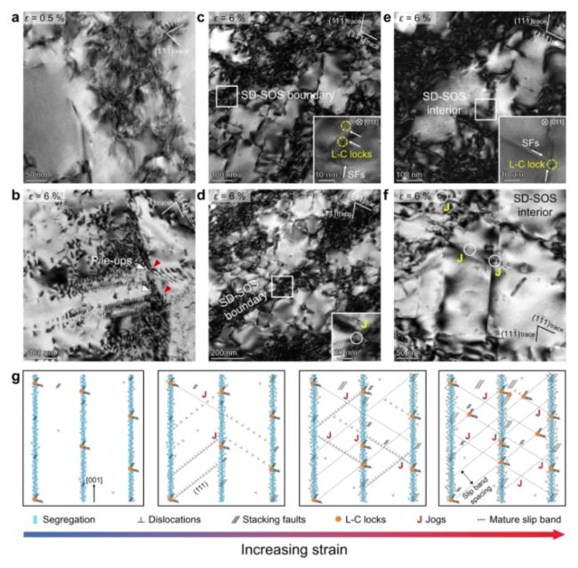 图4 激光选区熔化Ni35Co35Cr25Ti3Al2合金SD-SOS组织诱导的位错增殖及存储机制。a, SD-SOS边界处的位错滑移活动;b, 位错从SD-SOS边界处发射(由红色箭头指出),白色箭头显示了位错塞积; c, 滑移位错与SD-SOS边界相互作用产生大量的L-C位错锁。插图为白色矩形区域的HRTEM图; d, TEM明场图显示了滑移位错与SD-SOS边界相互作用产生的割阶; e, SD-SOS内部位错相互作用产生L-C 位错锁; f, 胞内滑移位错交割产生割阶; g, 变形亚结构演化示意图。