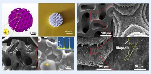 图2. 光固化增材制造磷酸三钙极小曲面人工骨支架及其细胞生长情况