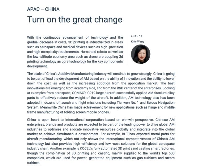 全球范围来看,新的初创公司减少,该行业正在转向盈利和战略重新定位,老牌公司正在通过并购来巩固地位。此外,行业驱动型需求的发展趋势明显,航空航天、国防、能源和医疗行业仍然是关键增长领域。这些行业有部署增材制造的明确路线图。
