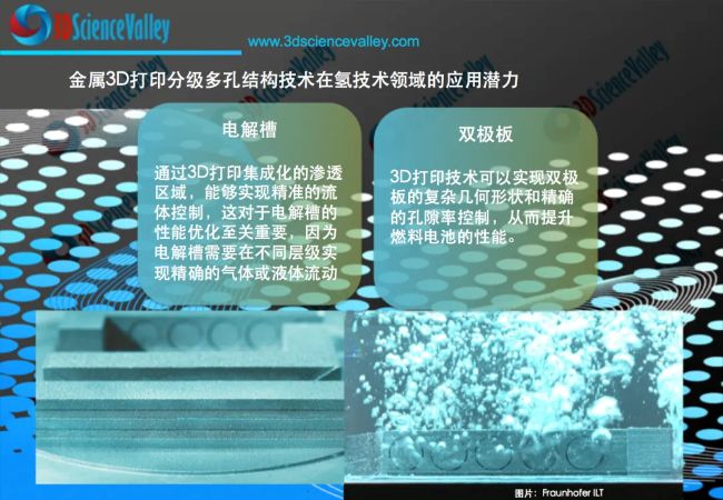 应用前景:该技术在需要以可控方式分配、过滤或引导气体或液体的领域具有巨大潜力,尤其是在氢技术领域,如电解槽。这些设备由复杂的细胞堆栈组成,弗劳恩霍夫ILT正在研究是否可以直接增材制造这些层,包括特定的渗透区域,以减少部件数量、提高效率并降低成本。