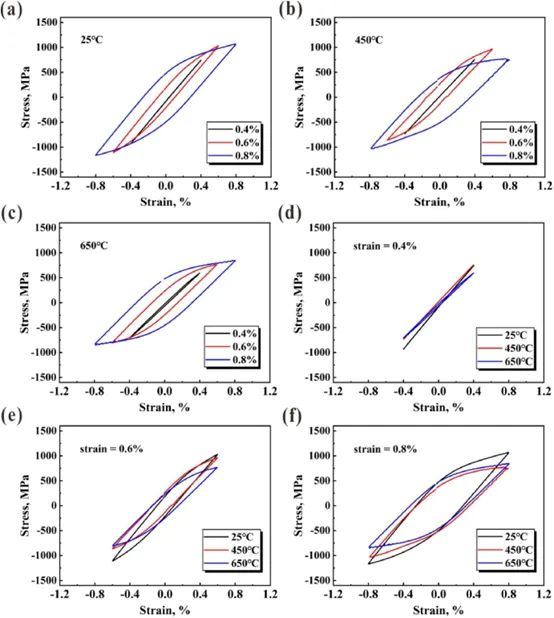 图13. (a-c)25°c、450°c和650°c下的半衰期磁滞回线;(d-f)应变幅度为0.4%、0.6%和0.8%时的半衰期磁滞回线