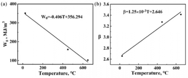 图15. 磁滞回线参数和相应疲劳寿命预测模型之间的关系:(a)W0和温度之间的线性关系;(b) β与温度的线性关系