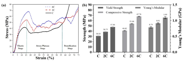 (1) 轮廓扫描次数与多孔植入物压缩性能正相关。随着扫描次数增多,多孔植入物的承载能力显著增强,其中6C多孔植入物相较于1C多孔植入物,压缩强度提高了约66%,弹性模量提高了约38%。扫描次数增加提高了多孔植入物实心率,宏观孔隙率下降,从而增加了实际承载面积。