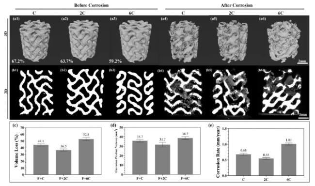 图2为多孔植入物浸泡实验前后的形貌对比图和腐蚀速率。从图2a-b可以看出,轮廓扫描次数对多孔植入物内部成型质量影响不大,但对宏观孔隙率影响显著:6C宏观孔隙率最低,为59.2%,1C和2C宏观孔隙率较高,分别为67.2%和63.7%,即随着轮廓扫描次数的增加,多孔植入物宏观孔隙率呈下降趋势。多孔植入物最终腐蚀速率如图2e所示,6C腐蚀速率最高,达到1.01mm/year,2C腐蚀速率最低,为0.55mm/year,6C腐蚀速率比2C高83.6%。