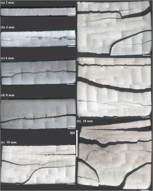 图3 不同打印高度(2-18 mm)方块(横截面20×20 mm)样品的宏观开裂形貌