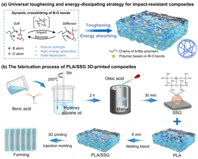 图1 一种通用的复合材料增韧和能量耗散策略。(a)将B-O动态交联聚合物作为二级填料引入脆性聚合物基体中,提高复合材料的韧性和冲击能量吸收性能;(b)PLA/SSG的制备流程示意图(SSG合成→熔融共混→3D打印成型)。