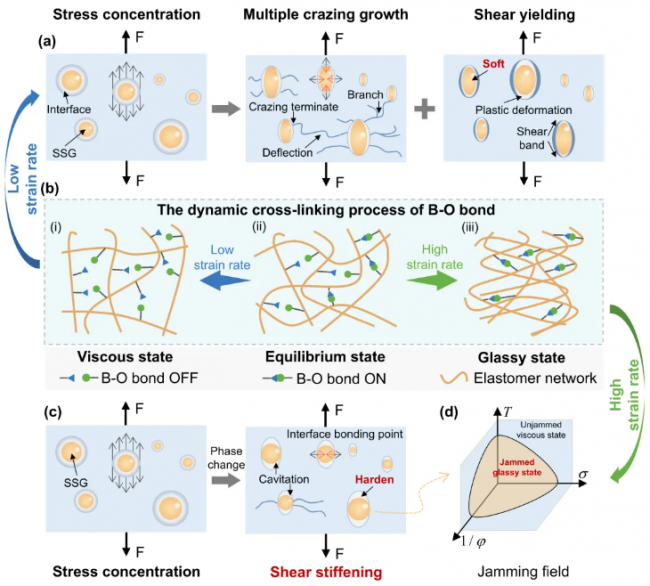 图5 增韧与能量吸收机制。(a)低应变率下PLA/SSG的增韧机制(多重银纹与剪切屈服的协同);(b)SSG分子链缠结与解缠结的应变率响应;(c)高应变率下PLA/SSG的能量吸收机制(剪切硬化);(d)SSG的jamming相图。