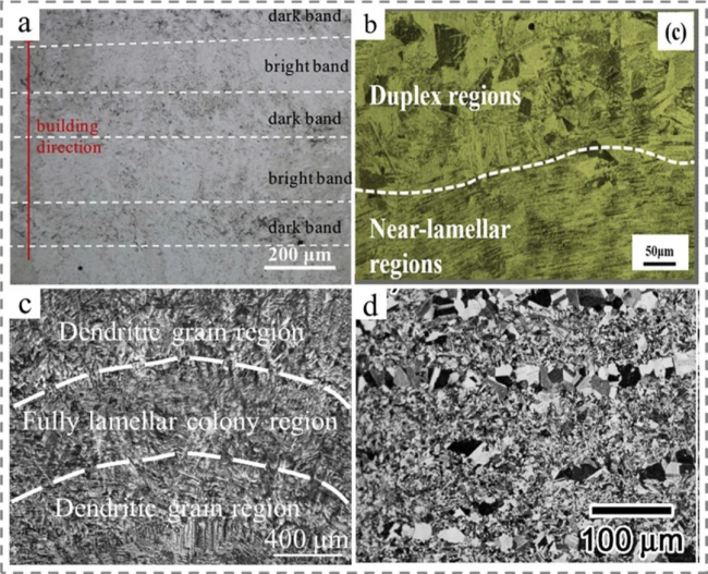 图6.不同增材制造技术制备TiAl合金的交替层带状微观组织