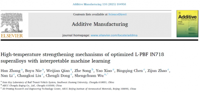 Han Zhang, Boyu Nie, Weijian Qian, Zhe Song, Yao Xiao, Bingqing Chen, Zijun Zhao, Nan Li, Changkui Liu, Chengli Dong, Shengchuan Wu*, High-temperature strengthening mechanisms of optimized L-PBF IN718 superalloys with interpretable machine learning, Additive Manufacturing, 2025, 110: 104958.
