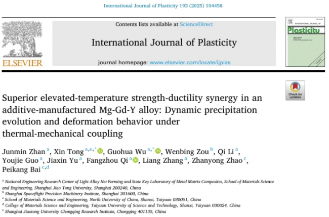 近日,上海交通大学材料科学与工程学院轻合金精密成型国家工程研究中心吴国华教授团队在高性能镁稀土合金增材制造领域取得重要创新成果,研究成果以“Superior elevated-temperature strength-ductility synergy in an additive-manufactured Mg-Gd-Y alloy: Dynamic precipitation evolution and deformation behavior under thermal-mechanical coupling”为题,发表在国际塑性力学领域顶刊《International Journal of Plasticity》上。本期谷·专栏将对分享这一创新成果。