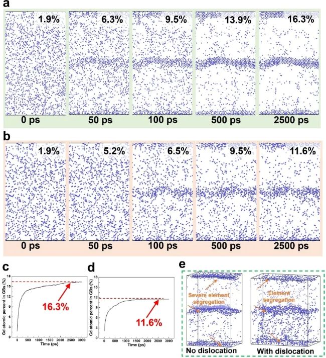 图3 通过分子动力学模拟研究晶内位错对高温下晶界稀土元素偏聚情况的影响