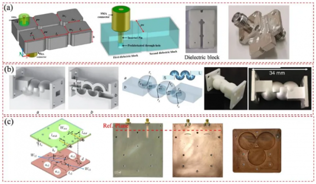 图1. (a)四阶介电波导滤波器,(b)基于四阶半球谐振器的BPF,(c)C波段三分滤波器。