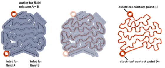 图10:可加热混合器概念设计研究(2D),具备几何结构复杂的流体控制功能;红色:集成加热器几何结构和连接点。