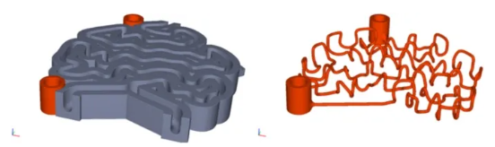为展示这些创新设计方法的潜力,我们开发了用于混合两种流体的演示零件:该零件不仅具有复杂路径布局,更在轮廓近端集成了电热导体。图10与11分别展示了零件的几何结构示意图与集成加热导体设计,图12则呈现了成型生坯(左图)及热成像仪下最终测试时的烧结零件状态(右图)。