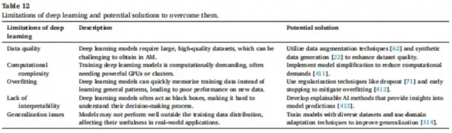 尽管深度学习模型是通过大量高质量的数据进行训练的,但理解它们的局限性对于正确使用它们至关重要。表12总结了深度学习的一些限制以及克服这些限制的潜在解决方案。