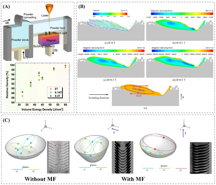 图14:磁场辅助激光粉末床熔融高温合金:(a) 静态磁场对IN718孔洞的影响;(b) 磁场对熔池的影响;(c) 磁场方向对熔体流动的影响。