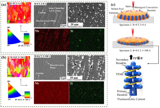 图18:磁场辅助增材制造控制高温合金的微观结构:(a) 有/无交变磁场下高温合金的晶粒形貌;(b) IN718合金的枝晶形貌和Laves相;(c) 不同磁场方向对增材制造高温合金的影响。