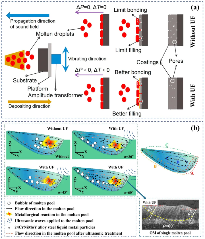 图5:超声波场对熔池动力学的影响:(a) 超声振动基板辅助增材制造;(b) 非接触超声波辅助增材制造。