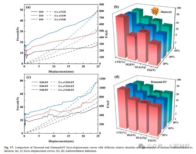 (3)多形态 TPMS 实现了梯度能量吸收,但由于整体建模的局限性,其在高相对密度结构中的压缩余量不足,导致有效压缩距离较短。然而在相同压缩位移下,其性能依然优异,降低了初始峰值力(Fi),同时SEA分别提升了20.6%、34.1%和41.4%。在狭窄空间中,其更高的碰撞安全性和梯度能量吸收特性使其应用更具灵活性。