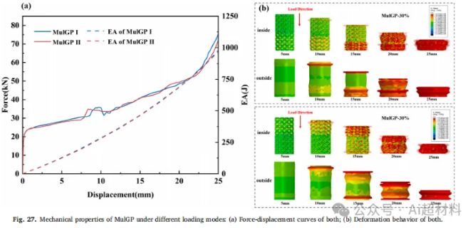 在本研究中,研究团队采用圆柱坐标系和堆叠方法构建了管状TPMS 、异形TPMS和多形态 TPMS ,并将其填充到双层圆管中。通过对比含双层圆管与不含双层圆管的有限元模拟及准静态压缩实验,发现双层圆管与内部结构通过相互抑制作用缓解了局部屈曲,显著提升了样品的能量吸收性能。