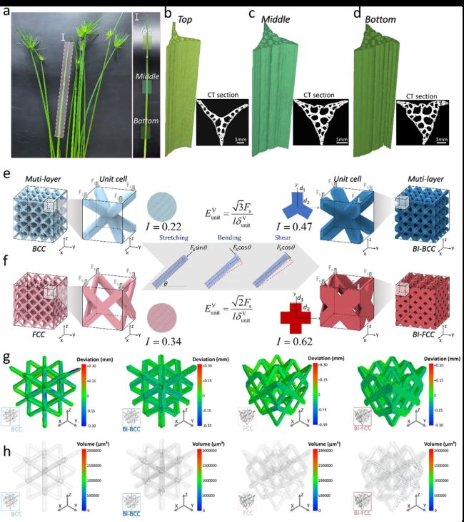 研究团队首先从自然界中寻找解决应力集中的“钥匙”。通过对纸莎草茎秆进行显微CT扫描与三维重构(图1a-d),发现其独特的三角棱柱形貌,这成为颠覆传统圆形支柱截面的灵感来源。基于此,团队设计了仿生体心立方(BI-BCC)和仿生面心立方(BI-FCC)结构。利用激光粉末床熔融(L-PBF)技术,成功制备了高精度(打印偏差<63 μm)、高致密度(相对密度>99.96%)的316L不锈钢点阵样品(图1g-h)。这证实了该仿生设计策略与先进增材制造技术的完美兼容性。