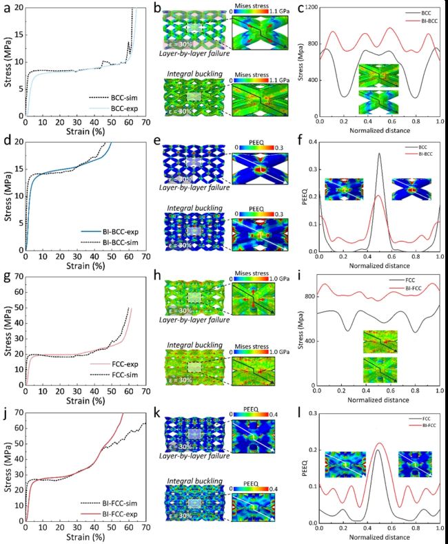 图4. 四种点阵超材料的塑性阶段有限元模拟。(a, d, g, j) BCC (a)、BI-BCC (d)、FCC (g) 和 BI-FCC (j) 点阵超材料的压缩应力-应变曲线;(b, c, e, f, h, i, k, l) 30%应变下的应力与应变分布云图及沿单胞对角线的归一化距离曲线:BCC与BI-BCC的Von Mises应力分布 (b) 与归一化距离曲线 (c)、等效塑性应变分布 (e) 与归一化距离曲线 (f);FCC与BI-FCC的Von Mises应力分布(h) 与归一化距离曲线 (i)、等效塑性应变分布 (k) 与归一化距离曲线 (l)