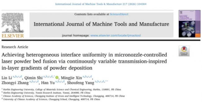 Lin Li, Qimin Shi, Mingjie Xin, Zhongyi Zhang, Han Yu, Shoufeng Yang,Achieving heterogeneous interface uniformity in micronozzle-controlled laser powder bed fusion via continuously variable transmission-inspired in-layer gradients of powder deposition,International Journal of Machine Tools and Manufacture,Volume 217,2026,104384,ISSN 0890-6955,https://doi.org/10.1016/j.ijmachtools.2026.104384.